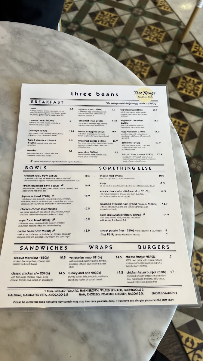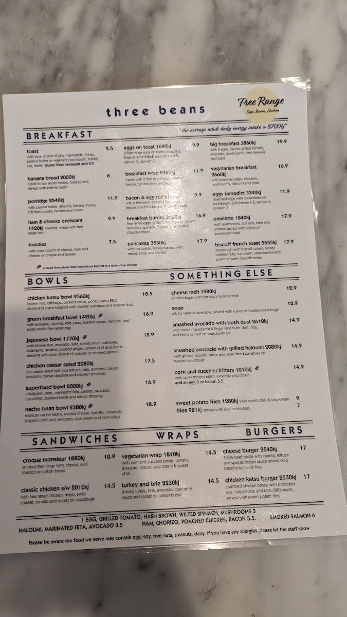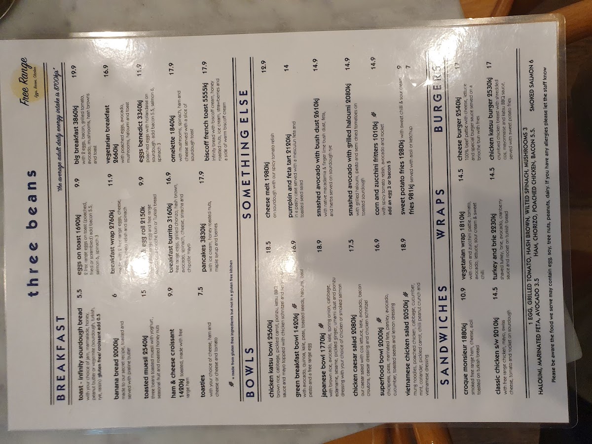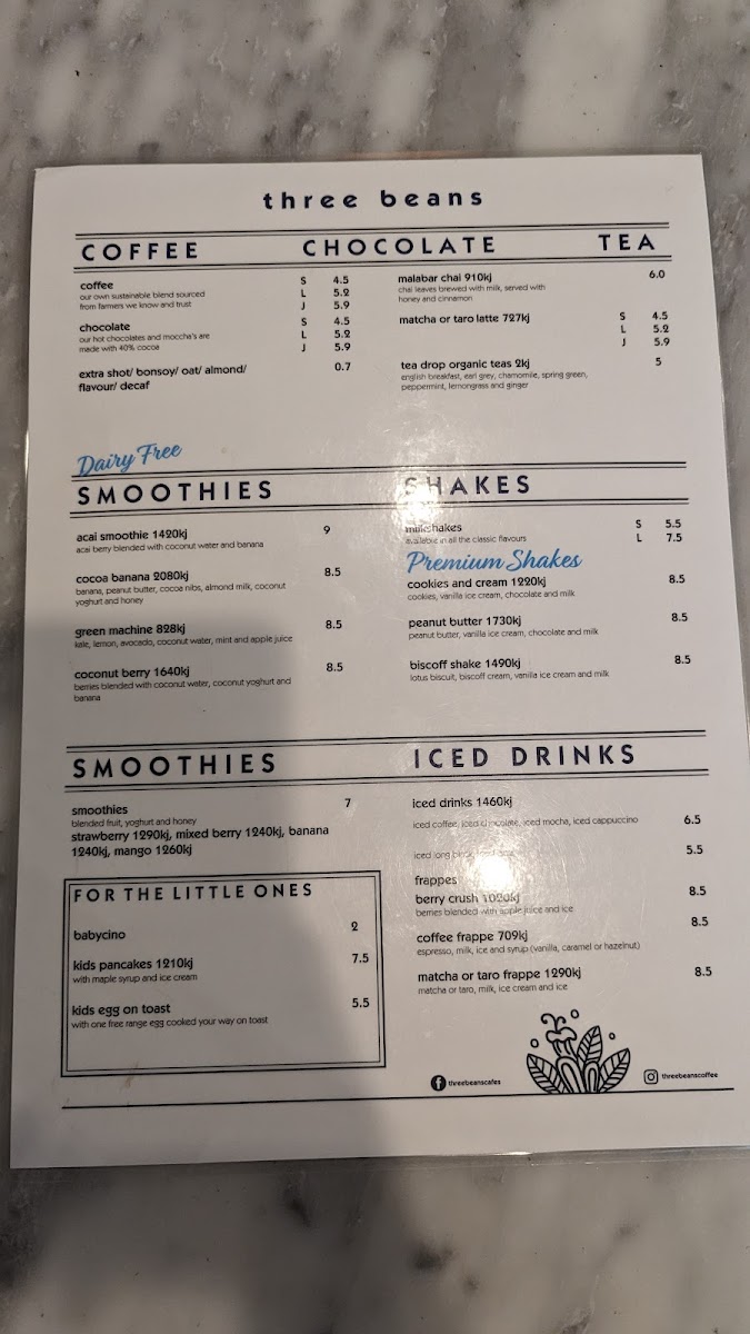 From the moment you glance at the menu at Three Beans Rhodes Waterside at Shop 44/1 Rider Blvd, Rhodes, it’s clear that variety is the restaurant’s strength. Breakfast options like Toast, Banana Bread 2000 kj, Porridge 2540 kj, Ham & Cheese Croissant, and Toasties offer both comfort and energy to start the day. For those seeking hearty bowls, choices include Japanese Bowl, Chicken Caesar Salad, Superfood Bowl, Chicken Katsu Bowl, and Nacho Bean Bowl, while the wrap selection features the Croque Monsieur, Vegetarian Wrap, and Turkey And Brie 2230 kj. Burger lovers are catered to with the classic Cheese Burger and the indulgent Chicken Katsu Burger 2530 kj. Sweet tooths will appreciate the Orange Jaffa cake, alongside premium shakes such as Cookies And Cream 1220 kj, Peanut Butter 1730 kj, and Biscoff Shake 1490 kj. Smoothie fans can enjoy dairy-free options including Acai Smoothie 1420 kj, Cocoa Banana 2080 kj, Green Machine 828 kj, and Coconut Berry 1640 kj. Little ones aren’t forgotten, with treats like Babycino, Kids Pancakes 1210 kj, and Kids Egg On Toast. The menu also extends to iced and specialty drinks, from Matcha Or Taro Frappe 1290 kj and Iced Drinks 1460 kj to Coffee Frappe 709 kj, while hot options such as Malabar Chai 910 kj and Matcha Or Taro Latte 727 kj round out the beverage offerings. Overall, the menu at Three Beans Rhodes Waterside strikes a balance between indulgence and health-conscious choices, providing something for every appetite and dietary preference.