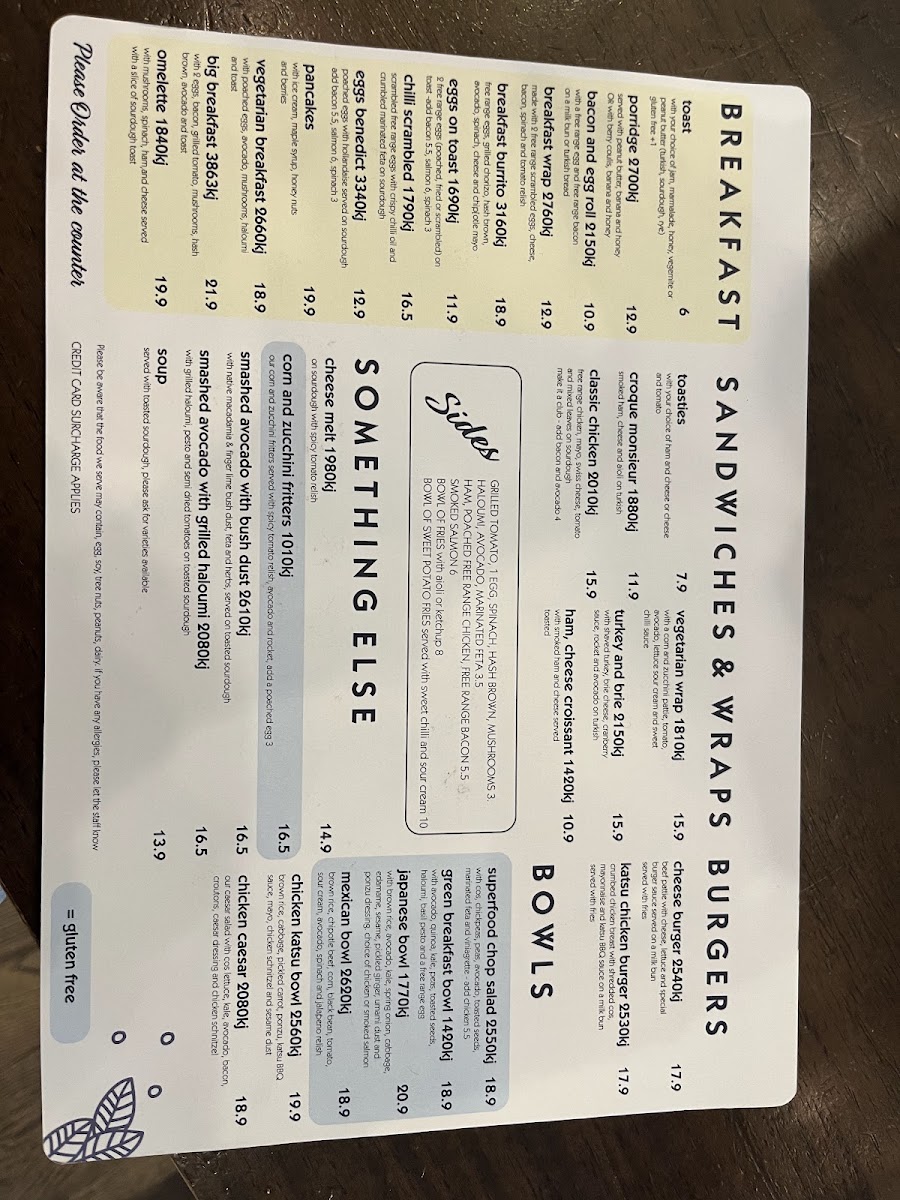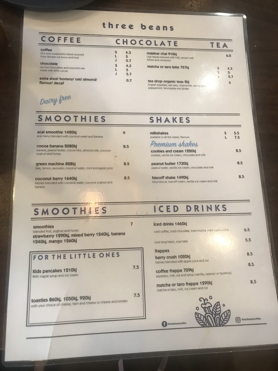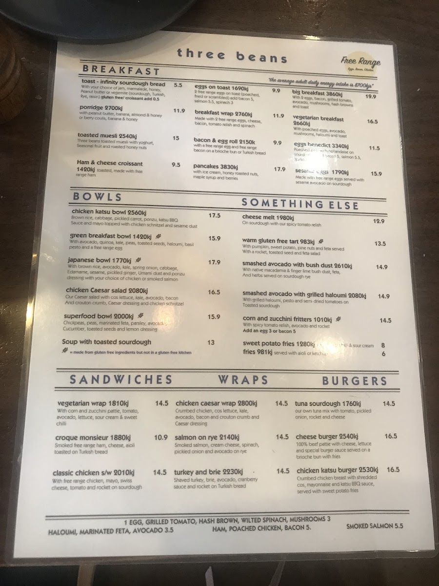 From the moment you glance at the menu at Three Beans Rhodes Waterside at Shop 44/1 Rider Blvd, Rhodes, it’s clear that variety is the restaurant’s strength. Breakfast options like Toast, Banana Bread 2000 kj, Porridge 2540 kj, Ham & Cheese Croissant, and Toasties offer both comfort and energy to start the day. For those seeking hearty bowls, choices include Japanese Bowl, Chicken Caesar Salad, Superfood Bowl, Chicken Katsu Bowl, and Nacho Bean Bowl, while the wrap selection features the Croque Monsieur, Vegetarian Wrap, and Turkey And Brie 2230 kj. Burger lovers are catered to with the classic Cheese Burger and the indulgent Chicken Katsu Burger 2530 kj. Sweet tooths will appreciate the Orange Jaffa cake, alongside premium shakes such as Cookies And Cream 1220 kj, Peanut Butter 1730 kj, and Biscoff Shake 1490 kj. Smoothie fans can enjoy dairy-free options including Acai Smoothie 1420 kj, Cocoa Banana 2080 kj, Green Machine 828 kj, and Coconut Berry 1640 kj. Little ones aren’t forgotten, with treats like Babycino, Kids Pancakes 1210 kj, and Kids Egg On Toast. The menu also extends to iced and specialty drinks, from Matcha Or Taro Frappe 1290 kj and Iced Drinks 1460 kj to Coffee Frappe 709 kj, while hot options such as Malabar Chai 910 kj and Matcha Or Taro Latte 727 kj round out the beverage offerings. Overall, the menu at Three Beans Rhodes Waterside strikes a balance between indulgence and health-conscious choices, providing something for every appetite and dietary preference.